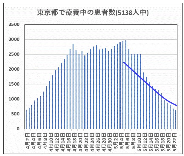 図:東京都の全感染者5136人のうち、自然治癒で減少した感染者数の推移:自然治癒によって、感染者(療養中の患者)が1か月で5分の1に減少している。