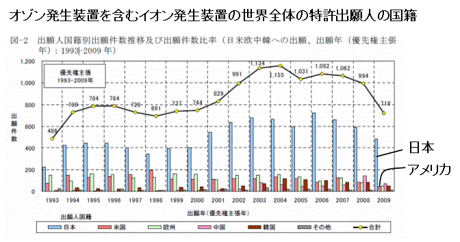 によると、 以下のグラフの様に、オゾン発生装置等のイオン発生装置の開発結果を表すと考えられる、世界全体への特許出願件数で日本が際立って多い。
