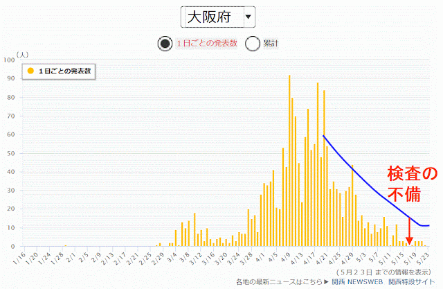 未発見の感染者が5分の1はいるので、新たに発見する感染者が、ピーク時の5分の1の10人を、毎日発見していなければ、検査体制がおかしいと考えます。
